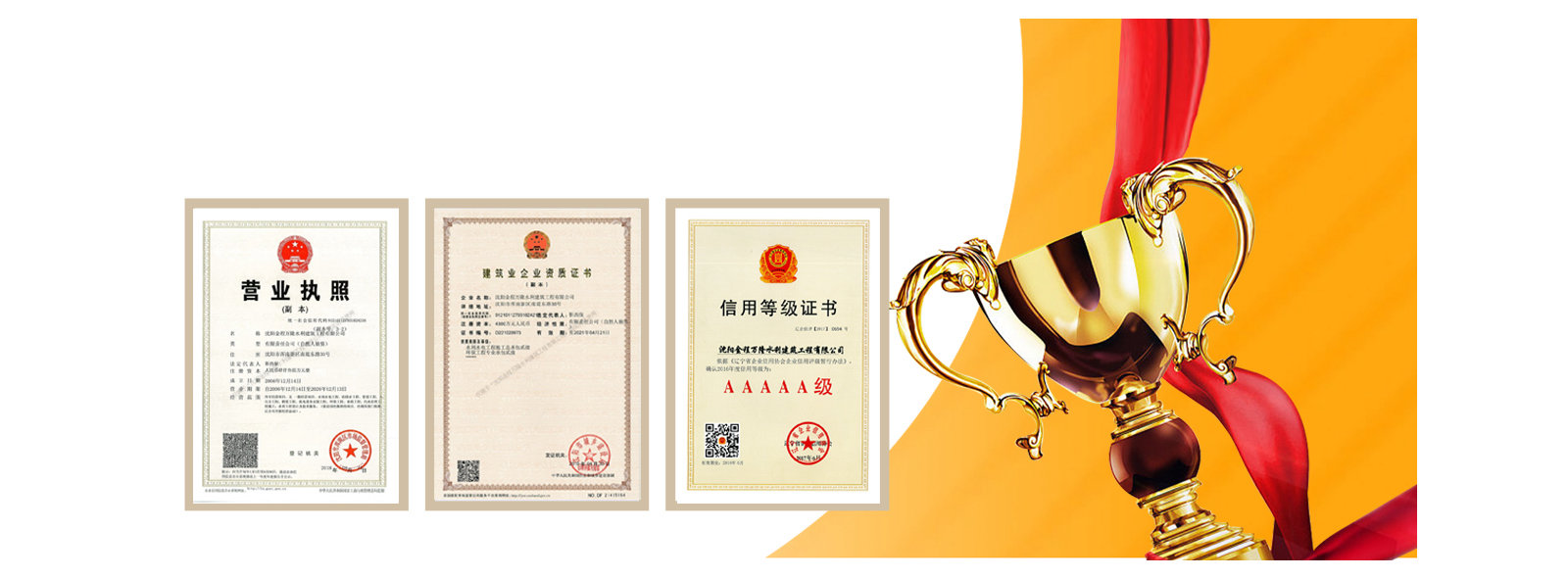 我公司先后受到遼寧省建筑業(yè)協(xié)會的好評,遼寧省及沈陽市工商局頒發(fā)的重合同守信譽企業(yè)稱號,勞動保障監(jiān)察書面誠信等級A,信用遼寧網(wǎng)站公示AAA等級,信用沈陽網(wǎng)站公示AAA等級,水利安全生產(chǎn)標(biāo)準(zhǔn)化二級單位,中國水利工程協(xié)會信用AAA等級,